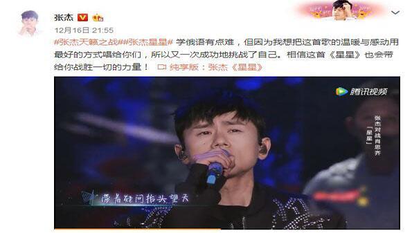 在《天籁之战》节目中张杰演唱的《星星》最近在网上走红。张杰凭借着超强的唱功,用歌声打动现场观众,让节目进入了高潮。