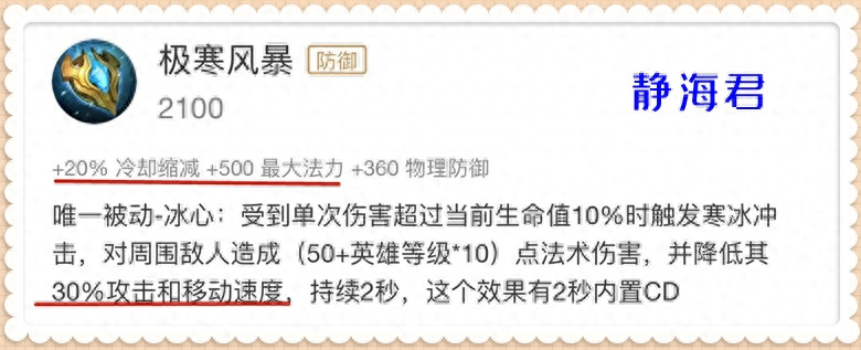 和冰痕之握相比,极寒风暴虽然没有生命值加成,但是它的冷却缩减属性(20%)和物理防御值(360)更高,并且极寒风暴还有着冰心这个可以造成伤害且降低目标攻速和移速的强力被动。