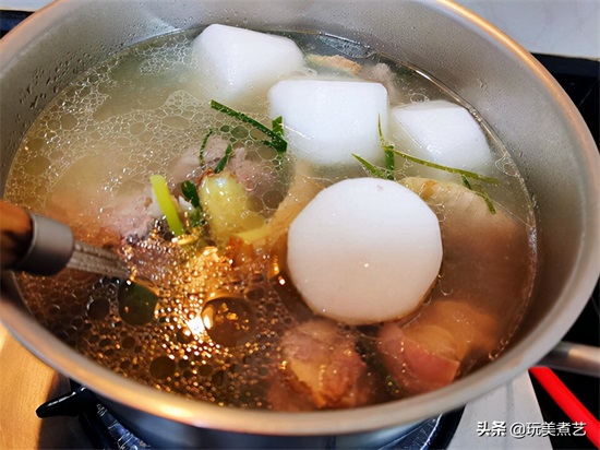 加入萝卜到羊肉锅中,继续炖煮30分钟。尝一下羊肉软烂程度,是否合口味,再来些酱油提鲜与调味即可。