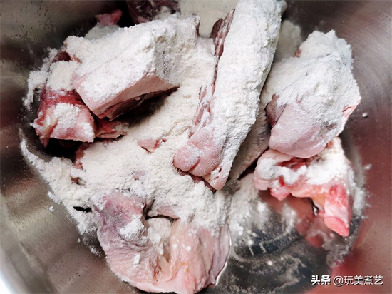 羊肉已由店家代劳砍好了,所以直接下面粉抓一抓,(带手套更好操作,以免黏乎乎的不舒服)尽量让每一块羊肉都裹上面粉,静置3分钟后,用水把面粉冲洗干净。