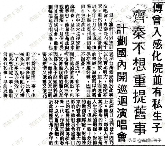 但攻击力最强的应该是五月份的新闻:“传齐秦曾入感化院并有私生子”。那时齐秦已踌躇满志想在内地开唱,表示不想理外界这些吵得乱七八糟的事。