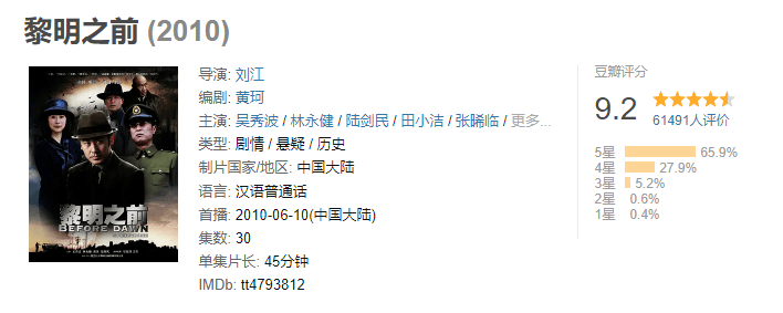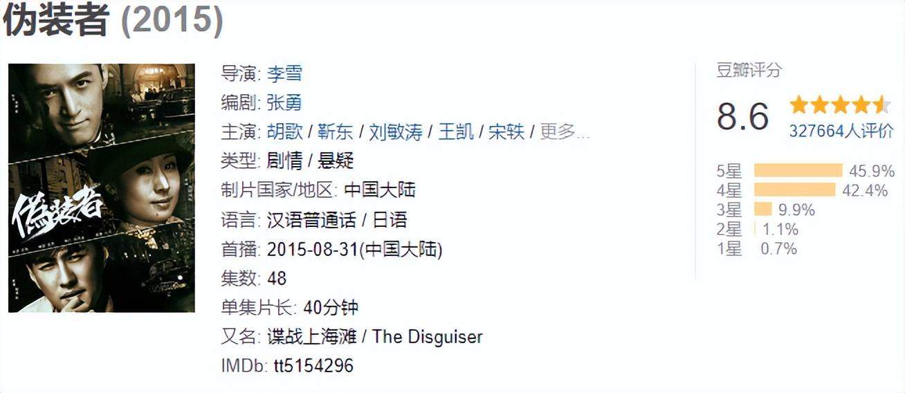 这部剧虽然并不是排名最高的,但仍不影响它在观众心中的地位,被称为“谍战剧”的巅峰。