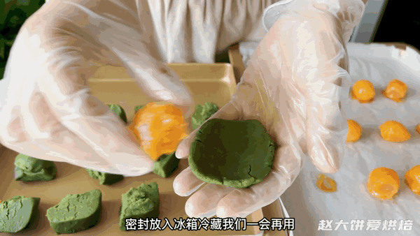 包入完全凉透的咸蛋黄馅,搓成圆球,密封放入冰箱冷藏备用