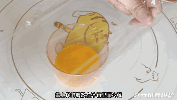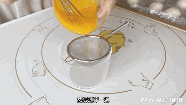 11,刷面的蛋黄液过筛一遍,盖上保鲜膜,放入冰箱冷藏备用
