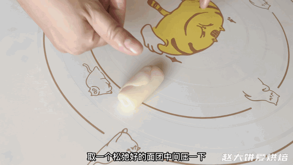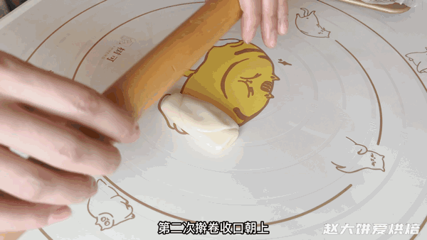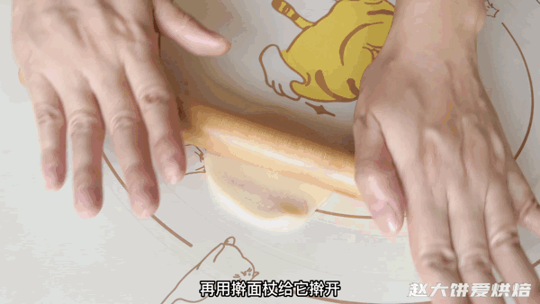 再卷起来,盖上保鲜膜,密封松弛15分钟以后再保馅