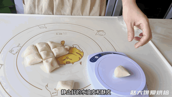 10,松弛好的水油皮和油酥各分成12份,水油皮19g/个,油酥12g/个