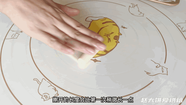 再从上往下卷起来,盖上保鲜膜,松弛15分钟再操作