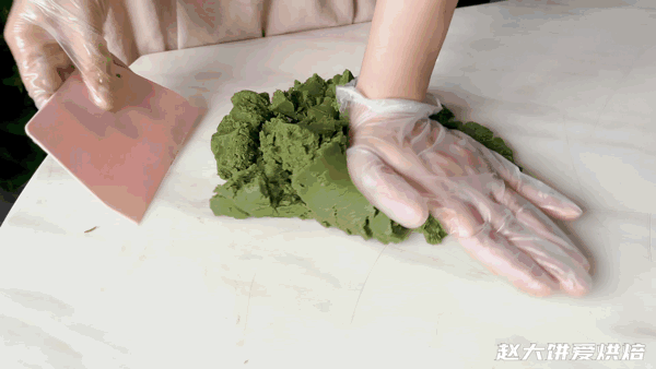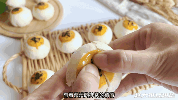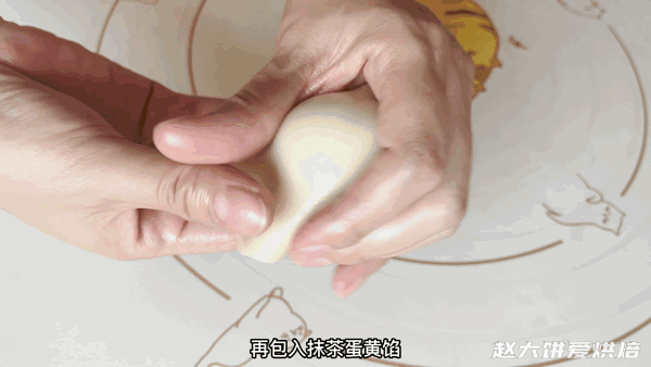 包入抹茶咸蛋黄馅,收口收紧(具体手法,大家可以观看视频)