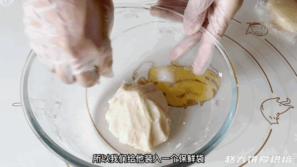 因为现在天气比较热,做好的油酥会偏软,装入保鲜袋,放入冰箱,和水油皮一起冷藏1小时左右再分割