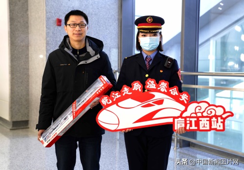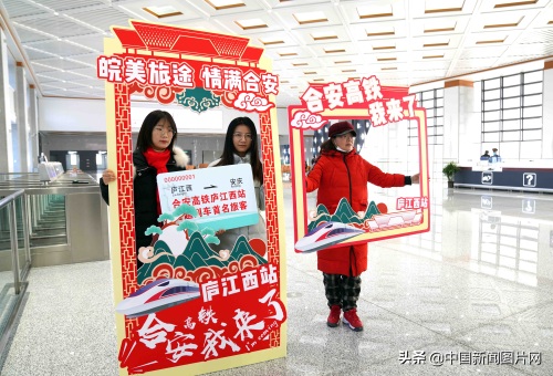 2020年12月22日,合安高铁正式开通运营,高铁庐江西站站房内旅客在首发列车现场合影留念。中新社发 周跃东 摄
