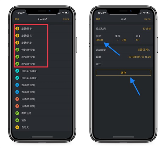 在「录入运动」页面这里, 下面圈着的都可以选择用来修改步数,一般选走路或者跑步都可以,我选择「走路 (正常)」,进入修改步数的页面,修改好你需要的步数之后,点击保存。
