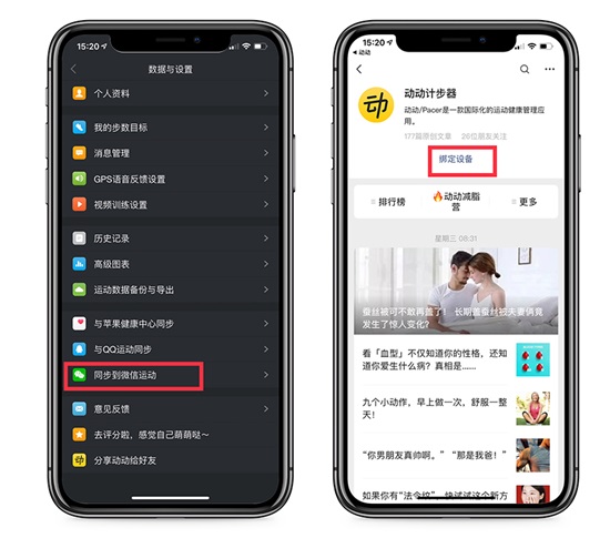 接着同步微信,返回软件的设置页面,点击「同步到微信运动」,就会跳转到微信页面,再点击「绑定设备」即可。