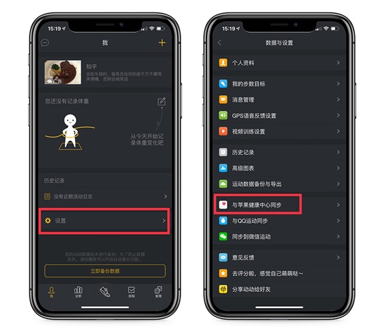 下载好软件之后,打开软件(无需注册),在「我的」页面,打开「设置」,点击「与苹果健康中心同步」。