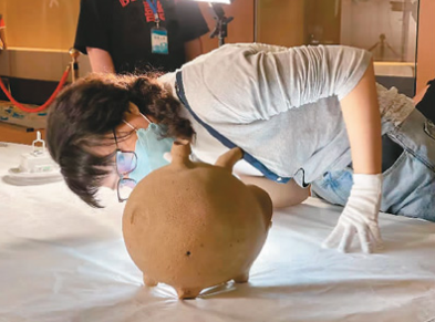 2025年6月,中国文物交流中心工作人员在北京展览现场布展。图中文物为刺猬形奠酒容器。可以看出,鸟类等形状的象征性陶器,并不在日常生活中使用,而是用于祭祀仪式。