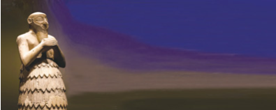 身着典型苏美尔人服饰、做祈祷姿势的祭拜者雕像。