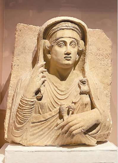 罗马时期叙利亚的文化遗产,首推建筑与雕塑。肖像雕塑题材多样,既有国王贵族,也有普通平民,体现了罗马雕塑着重于写实与故事,擅长刻画人物本来面貌的特征,是古代叙利亚的艺术代表之一。图为发现于帕尔米拉古城遗址的墓葬雕塑。