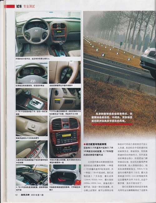 动力配置与性能表现方面:索纳塔目前有2.0升直列4缸和2.7升V6两款动力配置,2.7升车型的测试表现可圈可点。本次试驾的是2.7升V6发动机车型,最大功率129kw/6000r/min,最大扭矩245Nm/4000r/min,装备的是4速手自一体变速器。在公路上试驾时,就可以很突出地体会出它的动力表现肯定不会让人失望。发动机在中低转速时扭矩就很充足,提速很快,而到高转速时仍旧持续有力。另外其发动机噪音也很小,即使把油门踩到接近红线,发动机的轰呜声依然很饱满,给人很强的信心。经实际测得噪音值为:60km/h匀速车内噪声是63.2分贝;最大功率转速(6000r/min) 时驾驶员耳边定置噪声为66.8分贝,从这个数字看,其水平相当好了。