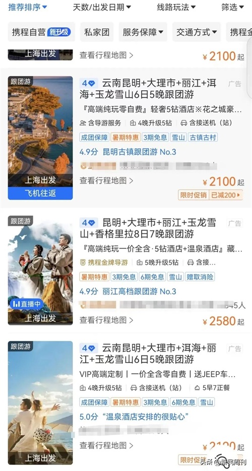 笔者梳理发现,早在2017年春节前,携程网上有一些“特价旅游团”设置了许多门槛,对消费者的地域、年龄、团体性别组成都有规定。其中一条跨国六天五晚的旅行团只需要2288元,在预订限制一栏明确写着不接受旅游从业者、记者、律师客人预订,对云南本地、西藏、海南、贵州、河南等多个地区的客人也不接受预订。后来,某平台对该类违规产品进行下架。