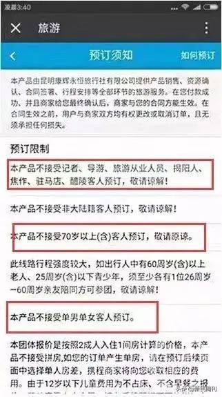 2017年,某平台上部分云南游产品,对游客的职业及地域进行了限制。图片来源/网络