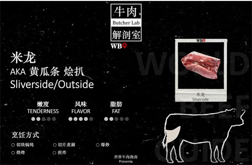 图中包含牛肉分割部位中英文名称、对应真实部位牛肉图片、分割部位图,介绍部位肉肉质特性嫩度、风味与脂肪比例以及适合的烹饪方式。