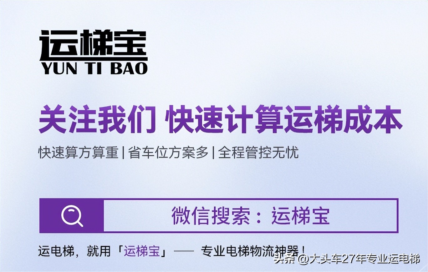 感谢阅读,欢迎关注运梯宝公众号。不管你是客梯、观光梯、别墅梯、货梯、餐椅、杂物梯、医用梯、自动扶梯、自动人行道或其他梯形。不管你是奥的斯电梯、通力电梯、日立电梯、三菱电梯、迅达电梯、蒂升电梯、快意电梯、富士达电梯、康力电梯、东芝电梯、永大电梯、森赫电梯、富士电梯、西奥电梯等电梯品牌。我们都可以计算运费(电梯重量、方量、运价、用车方案),【运梯宝】已实现全国200多个电梯品牌的精准运费运算。