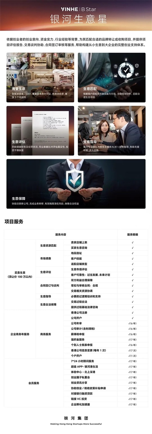 当然了,如果你是初次创业者,对经营店铺没什么经验,完全可以找专业的团队协助,银河集团的生意星和事业星产品,协助你高效在香港启动开店事业。以下这里就是案例: