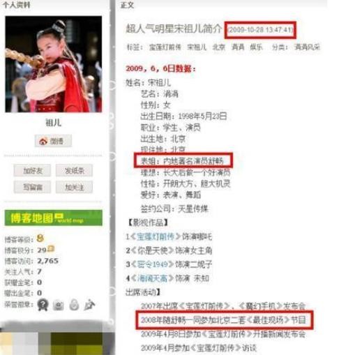 然而互联网是有记忆的,舒畅曾在自己博客讲述,小娟娟放假,二舅妈带着她到拍摄现场看她,就连08年舒畅做客《影视同期声之周末人物》,其中录制的一段短片中,正是舒畅和家人一起的画面,而怀里抱着宋祖儿。