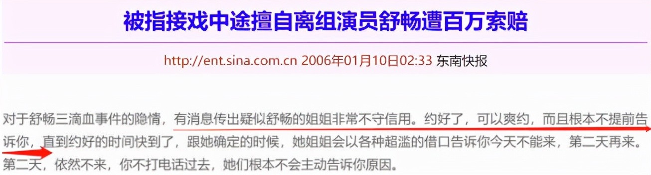 2006年,舒畅被冠上“轧戏王”的称号,正当红的她,成为不守信用爱爽约的演员。