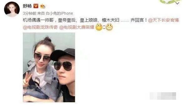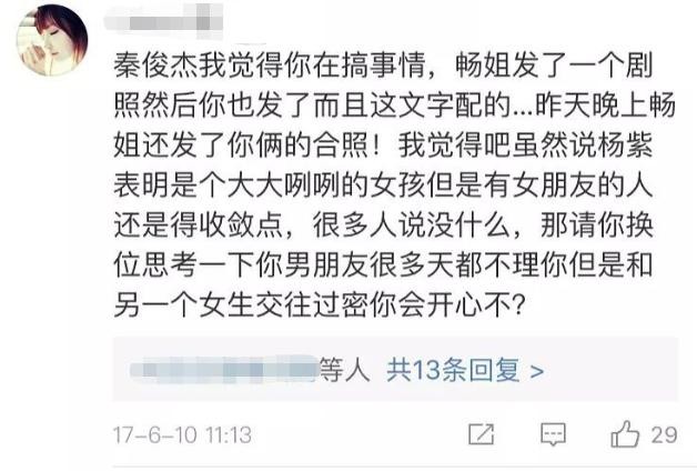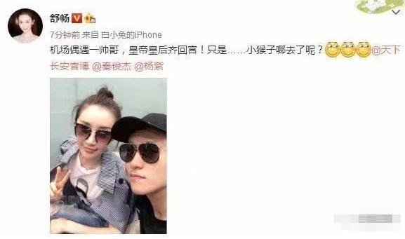 随后网友发现,舒畅发秦俊杰的合照,并且艾特杨紫。