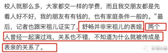 只是2016年,舒畅不知是何原因取关宋祖儿,并将两人所有互动,都删了个一干二净后。而宋祖儿也在求学归来,并通过《花儿与少年》打开知名度时,对外表示两人并没有血缘关系,舒畅也并非自己的表姐,只是一起演过戏,不知是为什么被传成表亲。