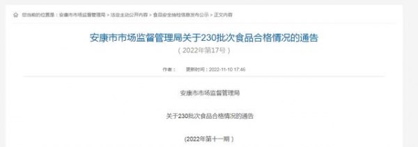 中国质量新闻网讯 11月10日,陕西省安康市市场监管局网站发布关于230批次食品合格情况的通告(2022年第17号)。本次该局对炒货食品及坚果制品、蛋制品、淀粉及淀粉制品、方便食品、蜂产品、糕点、酒类、蔬菜制品、速冻食品9大类食品230批次样品进行了食品安全监督抽检,所检项目全部合格。