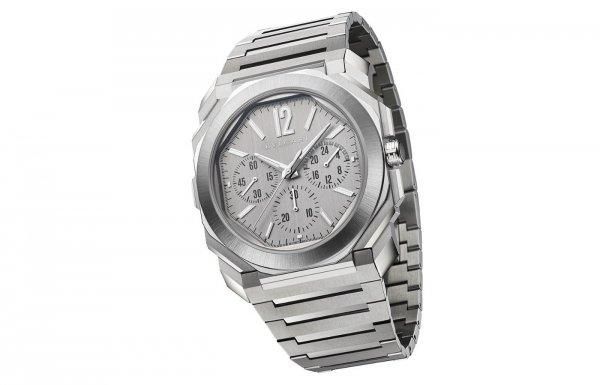 腕表点评:这只宝格丽OCTO系列是目前主流名表中最薄的自动计时表,并且保留了OCTO系列的经典造型。腕表的细节十分经得起推敲,表圈表盘纵向拉丝,表壳是抛光➕拉丝综合的设计,纹理华丽。精钢表壳厚度为8.75毫米,防水100米,在这个厚度的同时还做到了颜值与实用,不愧是你,宝格丽!这枚腕表和pp鹦鹉螺、ap16202长得很相似,原因是:他们都出自制表大师杰罗尊达之手。机芯是BVL 318超薄自动计时机芯,具备柱状轮+水平离合+GMT两地时,自动陀在机芯边缘上弦,各种部件几乎都水平布置在加大尺寸的机芯之上,在功能强大的同时,日内瓦条纹、鱼鳞纹这样美观的装饰也一点没落下。两地时按钮在9点位,和3点位的表冠刚好呼应,按一下就可以进行时区快调,又这么薄,真的很让人服气了。