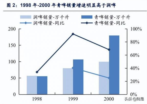回顾历史,润啤的发展可以分为四个阶段: 1993 年-2000 年:进军啤酒,蘑菇战略聚焦东北。1993 年,华润创业与沈阳啤酒厂合资成立华润(沈阳)雪花啤酒有限公司,进军内地啤酒行业。1994 年,为进一步拓展国内啤酒业务,润啤与南非酿酒公司(South African Breweries Group)达成合营协议。在啤酒行业产地销+重资产属性下,当时华润创业的总裁宁高宁、SAB 高层、总经理王群提出蘑菇战略,即是在区域市场里收购酒厂、逐渐建立强势地位,而一个区域种植蘑菇成功后,在相邻200-250 公里的区域再收购一家酒厂、同样建立强势地位,由此蘑菇连成片后形成大蘑菇,各个工厂之间的协同使得公司所在市场的集中度越来越高、避免了单打独斗,这也是目前业内所熟知的基地市场的由来。在蘑菇战略下,润啤从大连开始收购工厂,向东北发展,1997年并购大连渤海啤酒厂、2001 年以小吞大并购大连棒棰岛啤酒厂,在黑龙江、吉林、辽宁自建厂房,产能覆盖范围进一步扩大。1998-2000 年,公司销量从57 万千升增长到100万千升,CAGR 为 34.8%,此时润啤的增长速度略慢于青啤同期的53.2%。
