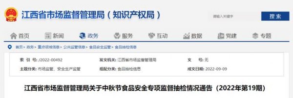 中国质量新闻网讯 据江西省市场监督管理局网站9月9日消息,为保障中秋节食品安全,近期江西省市场监督管理局组织专项食品安全监督抽检,抽取节日期间群众消费量大的糕点(含月饼)、炒货食品及坚果制品、酒类、糖果制品、食用油和油脂及其制品、肉制品、乳制品、食用农产品8大类食品共224批次,检出2批次不合格。