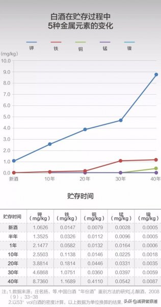 据上述鉴定方法,白酒中的钾、铁、铜、锰、镍等金属元素的含量会随贮存时间的增长而增高(如下图)。