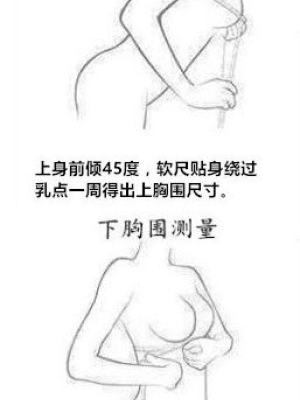 测量上胸围时,站立,上体前倾45度,用软尺以与地面垂直的角度测量最大围度。测量下胸围时,上体站直,用软尺紧贴乳房下围处,以正常吐气无障碍为标准,不能太松也不能过紧,允许误差为正负2.5cm。