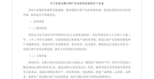 放眼全省来看,徽酒也有所布局。去年,安徽省经济和信息化厅、安徽省商务厅、安徽省市场监督管理局联合印发的《促进安徽白酒产业高质量发展的若干意见》(以下简称“意见”)的通知显示,到2025年,安徽白酒企业实现营业收入500亿元,酿酒总产量50万千升,培育年营业收入超过200亿元的白酒企业1家,超过100亿元的企业2家,打造一批在国内具有更高知名度和竞争力的企业,建成全国优质酒生产、研发和原料、包装基地,构建“品牌强、品质优、品种多、集群化”的安徽白酒产业发展体系,提升安徽白酒在全国的品牌影响力。