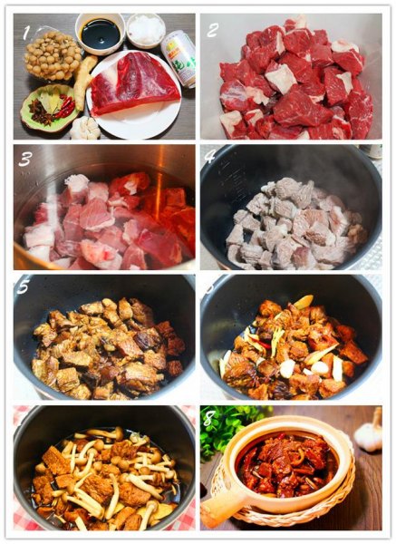第一步:准备食材。新鲜牛肉1000克、蟹味菇一包、啤酒一罐、红辣椒10个左右、姜一块、蒜一头、八角3枚、花椒适量、香叶适量、酱油半碗、白糖适量、盐适量。