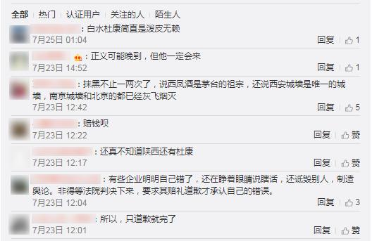 网友对白水杜康致歉一事的评论(来源:新浪微博)