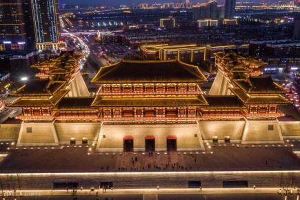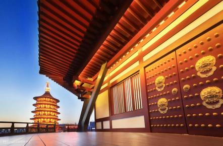 今天的应天门遗址以巨大的“门”字形建筑群为依托,采用充满创意的现代艺术手段,在夜晚营造出绚烂辉煌的3D投影灯光秀展示,古今辉映,重现隋唐洛阳之辉煌。
