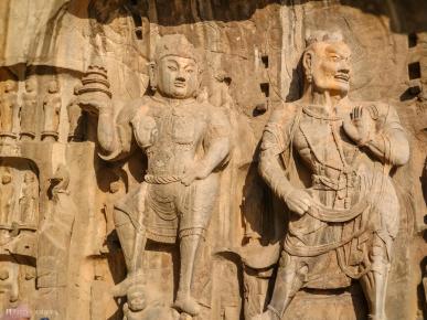 卢舍那大佛位于石窟的中后端,武则天根据自己的容貌仪态雕刻的,高达17米多,两旁为二弟子迦叶和阿难,另有表情矜持、雍荣华贵的菩萨,英武雄健的天王,咄咄逼人的力士,共九躯大像。