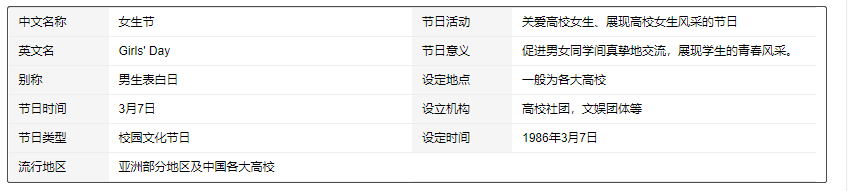 2,1991年诞生于广东工业大学的前身广东工学院,在男多女少的环境下,男生以"关爱女生"为宗旨,通过开展人文活动,引导女生提高思想素质和文化内涵,强化专业能力的培养,促进心理健康,但时间不是3月7日,而是每年11月的第三个星期,为期一周。