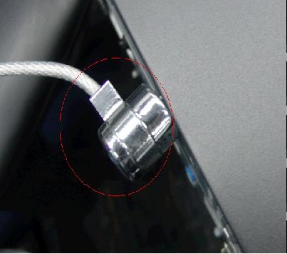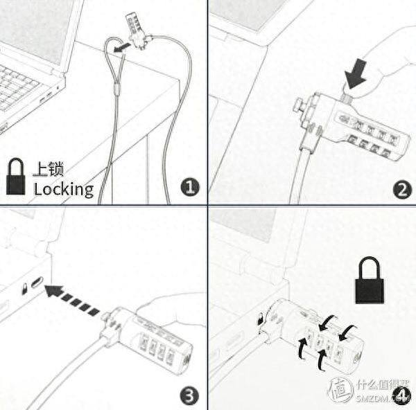 笔记本安全锁的使用方式比较简单,我们拿密码锁来举例,首先我们要找到一个不太容易搬移的物体作为锁体缠绕的对象,如果是桌子腿,可能搬一下桌子就“解套成功了”,所以参考马路边自行车跟栅栏锁在一起的案例最佳。找到缠绕的把目标之后把锁体穿过线缆的另一端形成闭环,再将锁体插入到安全锁孔内,按照使用说明设定密码即可。