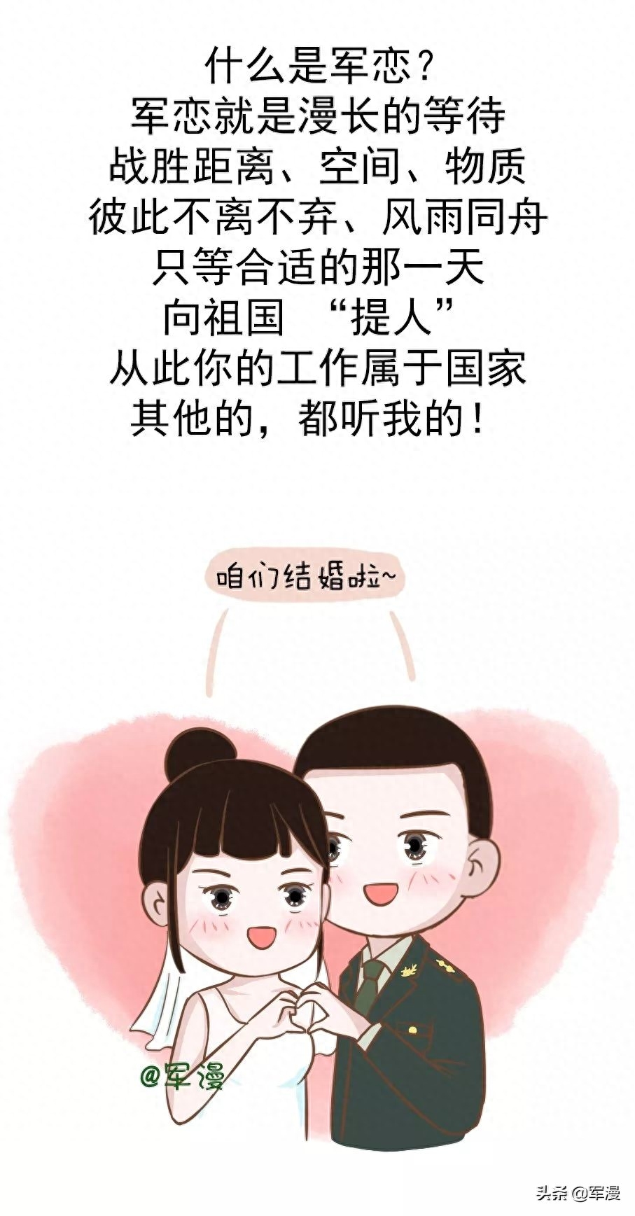 什么是军恋,军恋就是漫长的等待,战胜距离、空间、物质,彼此不离不弃、风雨同舟,只等合适的那一天,向祖国“提人”,从此你的工作属于国家,其他的,都听我的