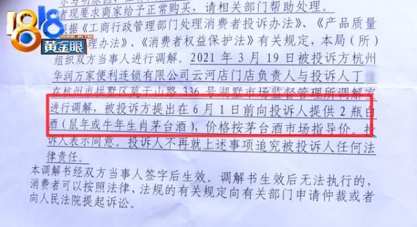 杭州拱墅区市场监管局的调解书注明:3月19号,被投诉方也就是华润万家杭州云河店提出,在6月1号前向投诉人,也就是丁先生,提供两瓶白酒,后面括号注明鼠年或者牛年生肖茅台酒,价格按茅台酒市场指导价。