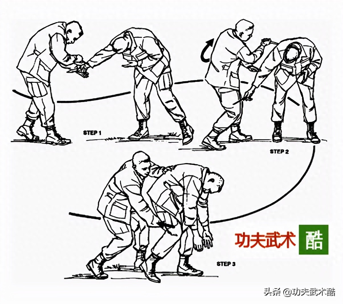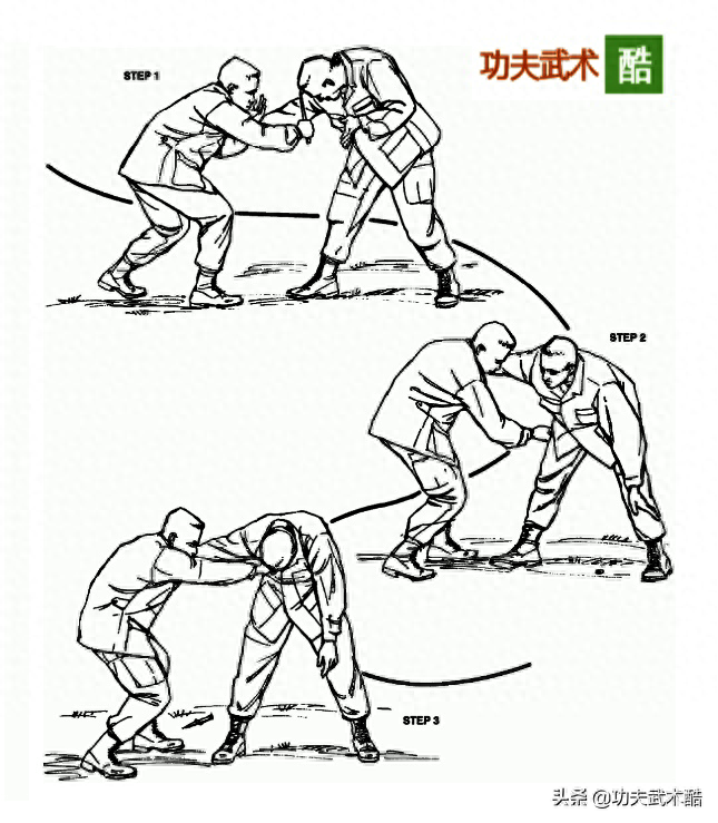 STEP4:上动不停,我方趁敌方胸腹部被划伤而疼痛向前低头弯腰之际,左手抓按敌方的头部或颈部,右手中的匕首再又顺势反向由敌方的右下腹部向左上方的心脏或咽喉划刺,将敌方结果。