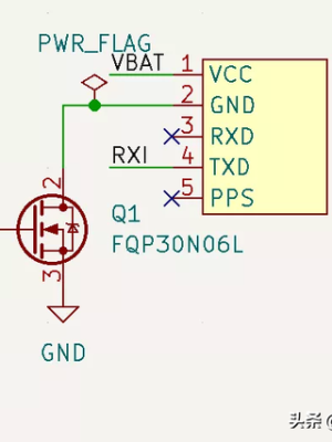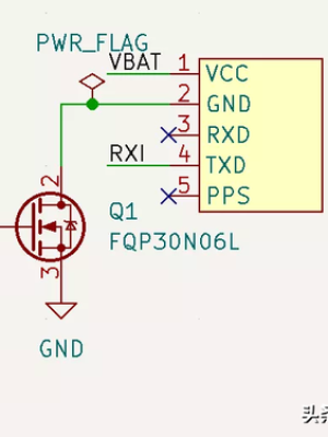 GPS的地线并不与GND相连,而是与MOSFET相连。这意味着从GPS到微控制器的UART信号会有MOSFET的压降加在上面(Vds),增加了噪声的敏感性,并可能造成的错误。如果你的微控制器的输入被规定为3.3V的最大值,你就不会想使用这种设计(我选择的ATMega328P没有这个限制)。3.3V(上面的EN引脚)对每个MOSFET来说都不是一个很强的开启数字电压。