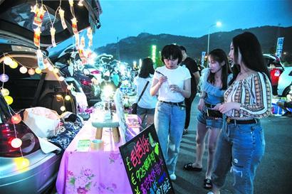 一摊主用灯光把后备厢装点得绚丽夺目一游客穿汉服逛集市。刘栋摄