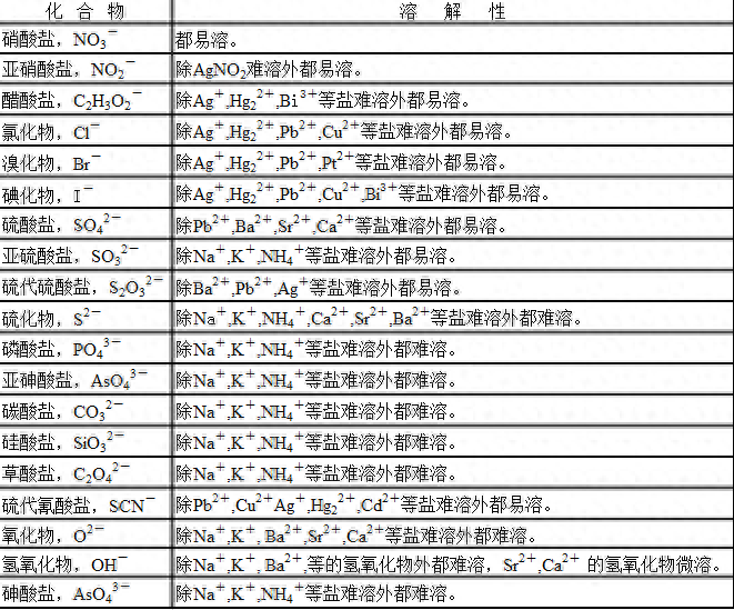 注:“溶”表示那种物质可溶于水,“不”表示不溶于水,“微或略溶”表示微溶于水,“挥”表示挥发性,“—”表示那种物质不存在或遇到水就分解了。