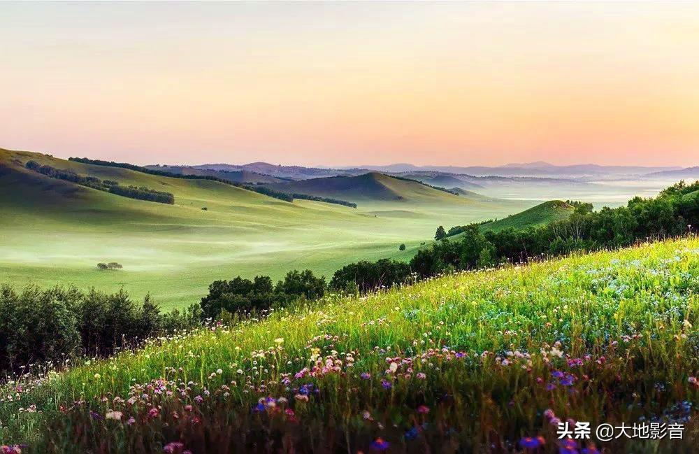 连绵起伏的丘陵草原上点缀着白桦树稀稀疏疏,有单棵的,有三五一簇的,有几十棵成丛的……,美不胜收,一处比一处美。蓝天、白云、青山、白桦林衬托着喧闹的百花世界,勾勒出一幅幅绚丽多姿的欧式油画。
